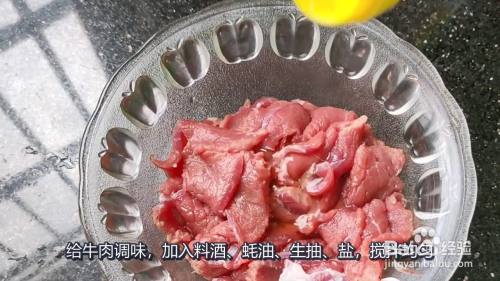 给牛肉调味,加入料酒、蚝油、生抽、盐,搅拌均匀,再加入一勺淀粉和一点花生油搅拌均匀。