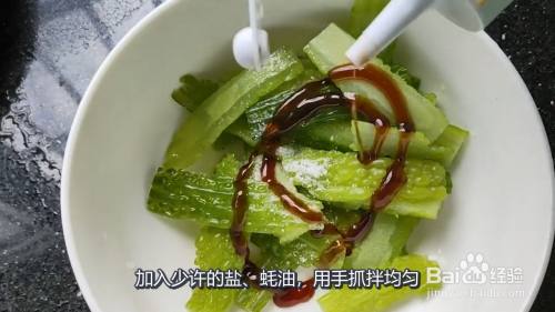 加入少许的盐、蚝油,用手抓拌均匀,抓拌均匀的苦瓜放入盘中摆好。