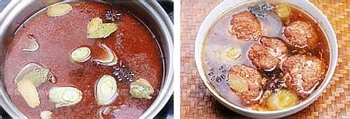 锅内高汤放入葱姜大料大火煮开;将煎好的丸子放入汤内;放入大碗中,上锅开锅后,中火蒸45分钟即可,出来后可以撇去一点浮油、捡去葱姜八角