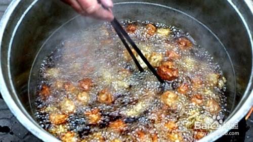 9.油开后,放入肉丸大火炸,时不时用漏勺翻转丸子,使其均匀受热。如油温上了一定温度,丸子变色了,这时转中火炸。