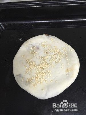 收口朝下,用手按一下,用擀面棍擀开,粘上芝麻,放在烤盘上。