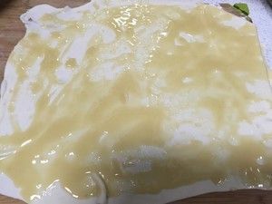 全部准备完毕后,我们将准备好的面团擀开成薄片。