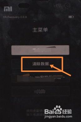 在关机状态下,同时按住“电源键”和“音量键”。稍后屏幕亮了进入主菜单选择清除数据