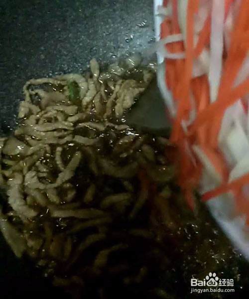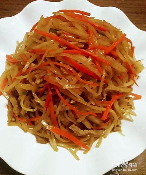 把苤蓝和红萝卜切成丝,瘦肉也切成丝备用。
