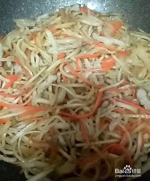 然后下入少许的葱花和酱油翻炒几下,再下入苤蓝和红萝卜丝翻炒。