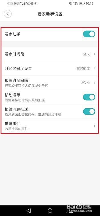 第四步在看家助手设置界面,首先开启看家助手,然后看家时间段选择全天,灵敏度设置为高灵敏度,报警时间间隔5分钟,开启移动追踪,报警消息推送,如下图所示: