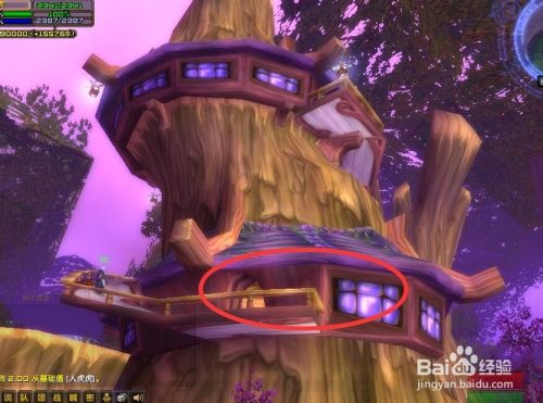 我们到达任务点以后,可以看到一个很大的树屋,树屋后面的天空是紫色的,要找的任务人就在树屋的第二层
