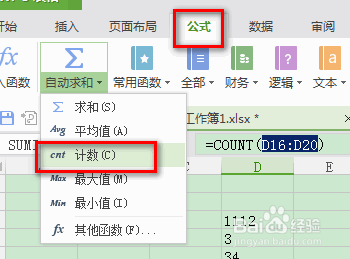 选择工具栏中的公式,然后点击自动求和的下拉箭头,选择计数;