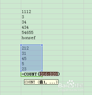 这样就计算出来非空格单元格个数的计数值了,其中honsef 那个单元格的个数并没有计算,因为它不是数字,而是文字,COUNT不对文字进行个数的计算。所以结果是10。