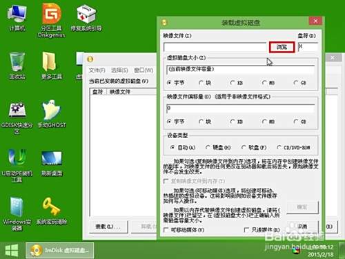 此时会弹出一个装载虚拟磁盘窗口,点击“浏览”按钮,如下图所示: