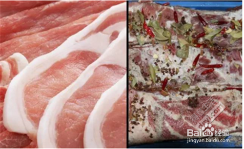 首先,杀下来的猪肉顺着猪肋骨剁成两千克左右的长条,放在容器里抹上盐、五香粉等香料腌两到三天。一般放盐是比较多的,所以腊肉吃起来都是比较咸的。