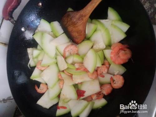 再将葫芦瓜放进去炒,炒一会后放些水进去(避免粘锅),在炒段时间等水快没了放入适量的盐,(拿筷子尝试有木有熟,味道是否适中,如果没有在调整),最后翻炒会就可以了。
