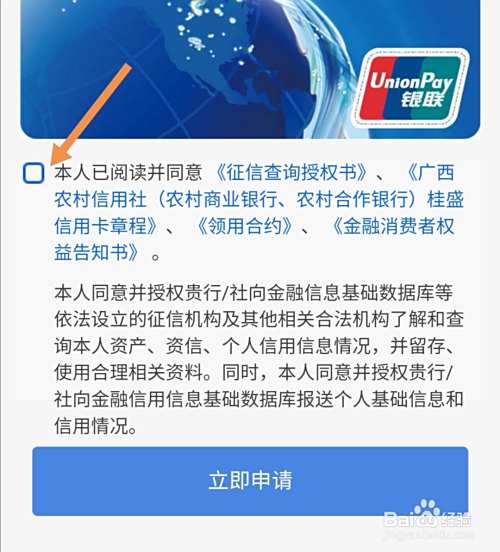 勾选同意协议,并点击立即申请填写信息完成操作,即可完成广西农信AP申请信用卡