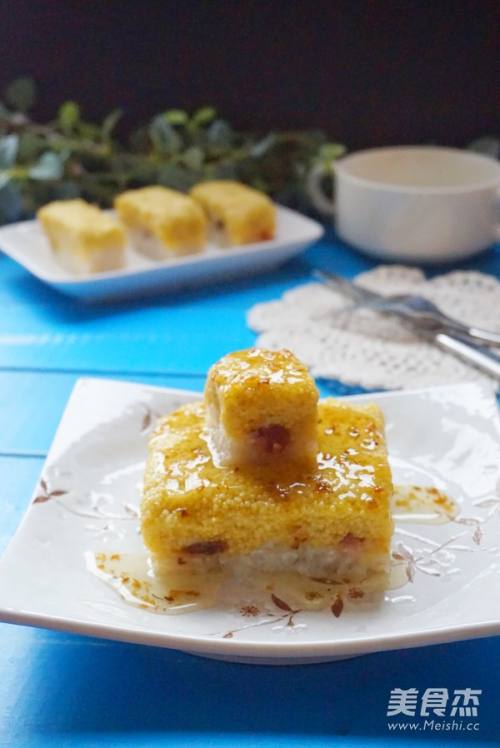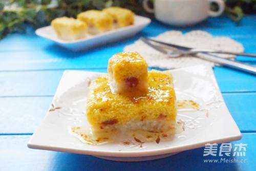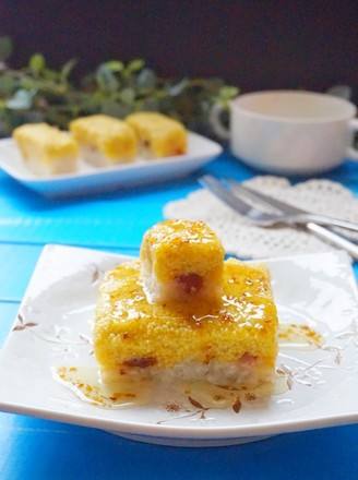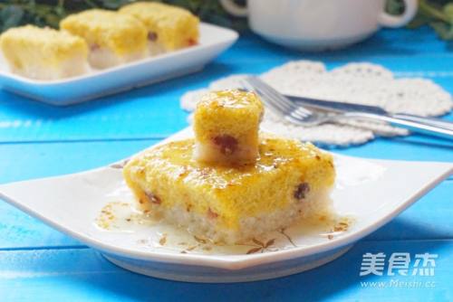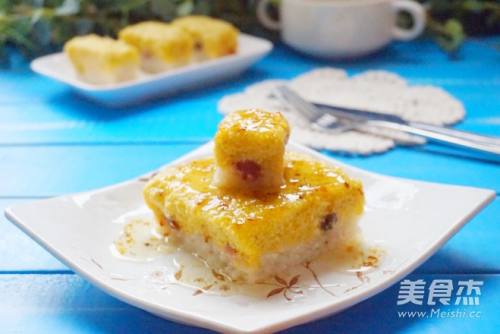 6蒸好后的粘糕,等凉了以后盖上保鲜膜放凉了再切块吃,趁热吃更糯,随自己喜欢也可以冷藏以后吃凉的。