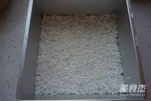 2米泡好以后,找一个能上锅蒸的容器,我用的八寸方形蛋糕模,你家里盆子盒子随你,如果是固定容器底下要垫上油纸货垫布好脱模。先在容器底部把白糯米铺好,再次提醒米一定是充分泡开的。