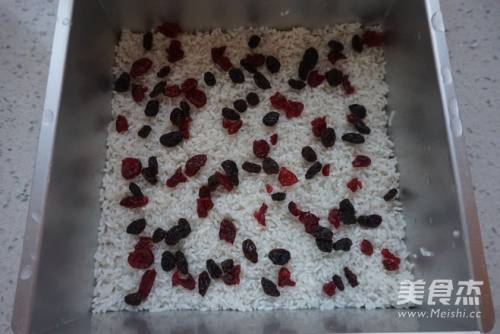 4在白糯米上面撒一层葡萄干和蔓越莓干,根据自己喜欢放,蜜豆什么的都可以。铺米的时候可以少量带着水一起。