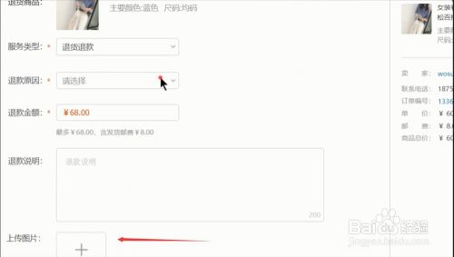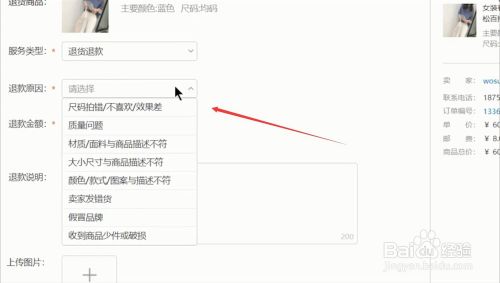 然后会弹出退款申请页面,需要填写退款信息,首先选择“退款原因”,一般卖家可能会让你填写7天无理由退货,如图所示。