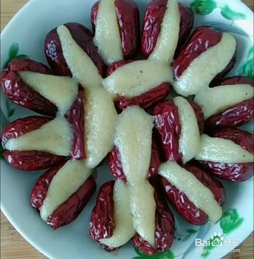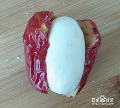 准备些大枣,洗净,去核,切成两瓣,不要断。