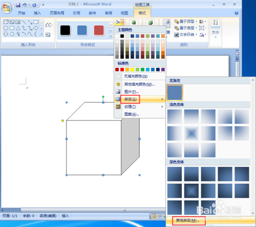 在word中,我们可以给创建好的图形添加各种效果,下面来介绍一下如何在word中给正方体添加宝石蓝渐变和阴影效果。