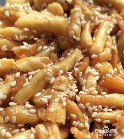 倒入炸好的面条,撒入白芝麻,翻炒至糖浆完全包裹住面条。