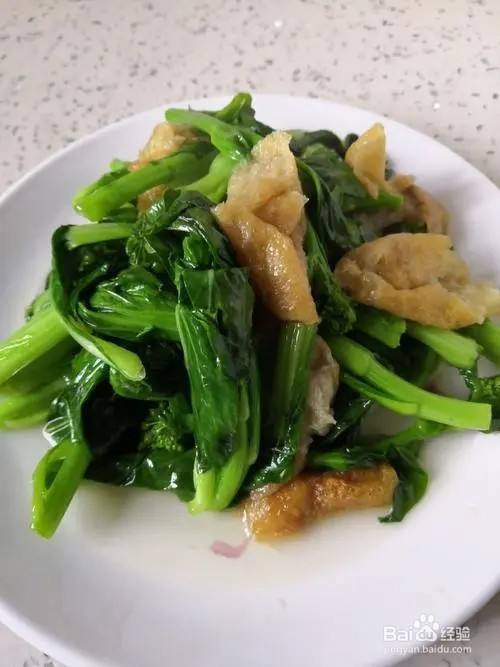 锅内放入少许油,放入葱花炒香,放入面筋煸炒2分钟后放入小油菜翻炒。