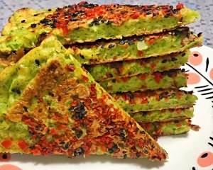 再将红萝卜碎均匀撒在上面如图,最后将黑芝麻均匀撒上面,盖上盖子煎至两面金黄