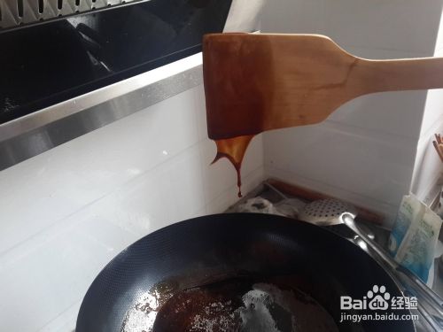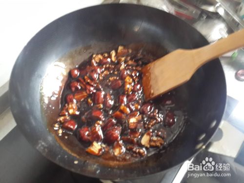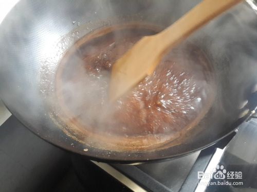 4、倒入冰糖,继续搅拌至有点浓稠起芡,注意需要能够挂旗状态进行下一步