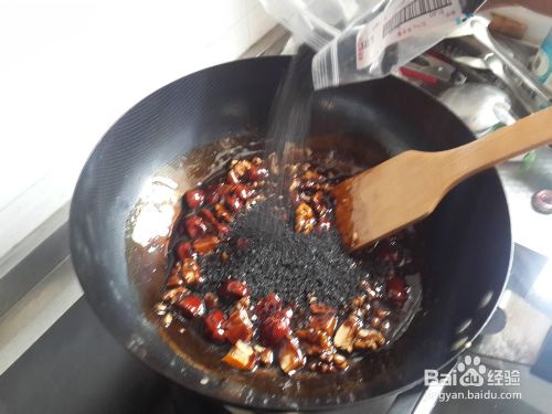 6、加入黑芝麻,搅拌一起,这时会慢慢拉出丝来,关火,再拌一分钟。