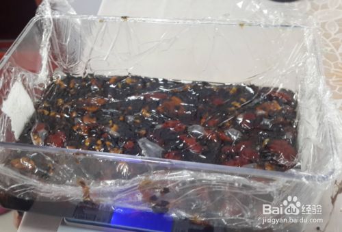 7、模具中摸上油,将熬好的糕倒入模中,上面盖上一层保鲜膜,压实。
