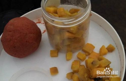 红薯诱饵:把红薯蒸熟,切成2~3厘米见方的红薯丁,在红薯丁的外面粘些炒香的麸皮粉,直接撒到钓窝,不要撒得太多,一次5~6粒即可。