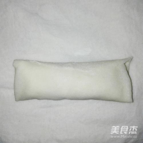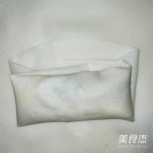 3取一张春卷皮,放上鸡蛋,火腿肠,菌菇。
