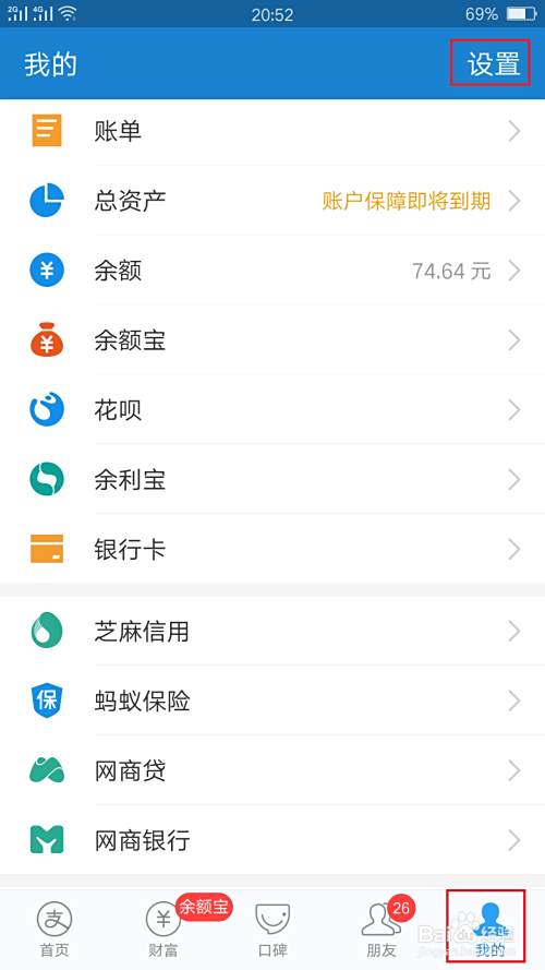 进入支付宝以后,点击页面右下角的我的,然后找到“设置”一项,点击进入。