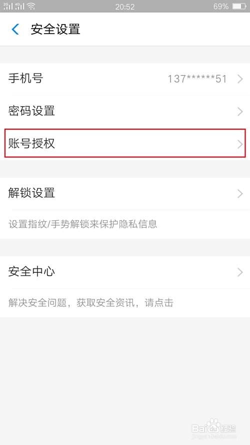 进入安全设置以后,找到“账号授权”一项,点击进入。