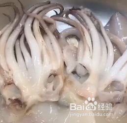 鱿鱼清理干净,放盐、味精、料酒、鸡粉,拌匀