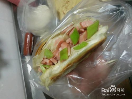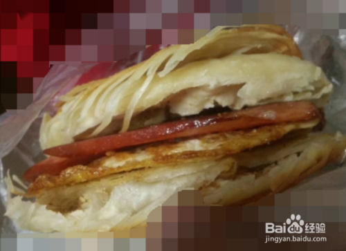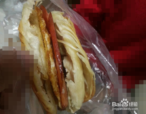 将鸡蛋和肠放进去,合起来。好吃的肉夹馍好了。