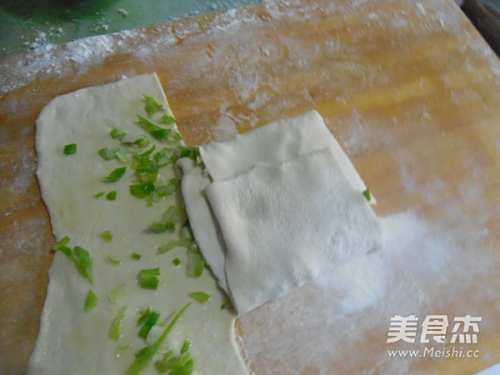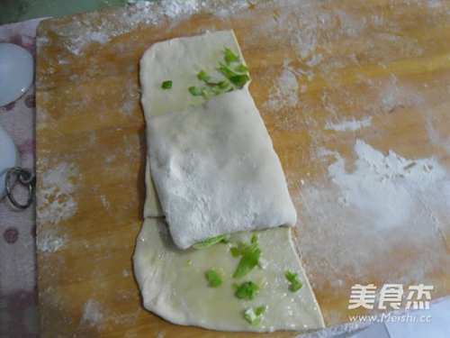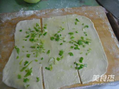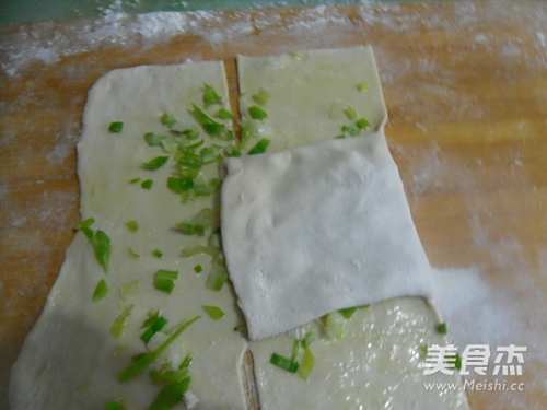 5抹匀一层橄榄油,撒少许盐,撒匀葱末。然后如图切四刀