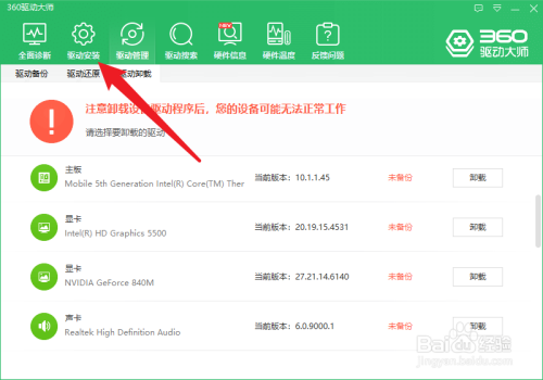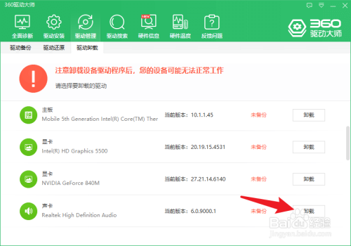 在驱动列表找到声卡驱动并点击旁边的【卸载】按钮。