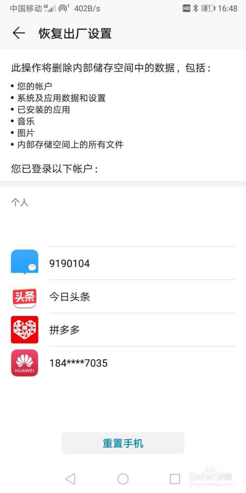 恢复出厂设置会将自己的账户里面的文件都清理,点击重置手机。