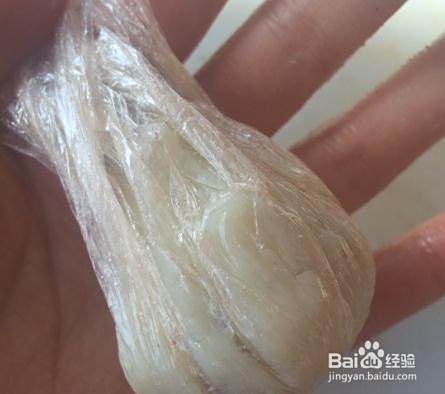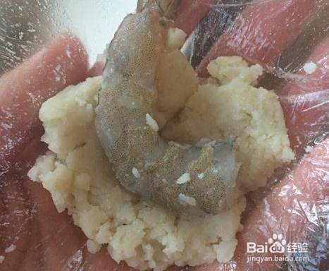 用一小块保鲜膜,取适量土豆泥,包裹上虾仁,露出虾尾部分。