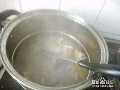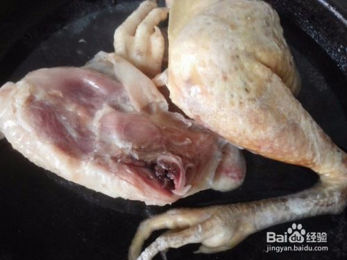 将切好的鸡腿、姜片、花椒等连同三七根一起放到锅里,加水4公升,让水面淹过鸡腿。