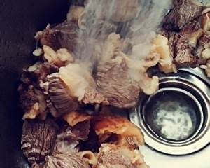 把所有材料和牛肉下锅,放凉水,水不用特别多,如图没过牛肉就行,如果喜欢多牛肉汤的可以多放水,为了节省时间,我用了高压锅,高压锅上汽后大火10分钟。如果没有高压锅家里的普通锅,大火20分钟,转小火90分钟,中途别打开锅盖