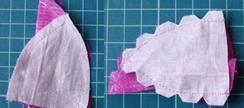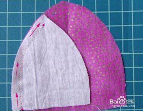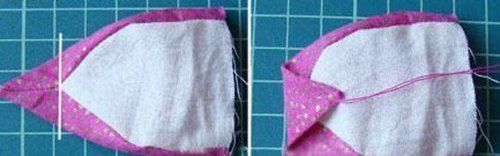 缝好后翻过来,这样红色布料会有一个三角形的尖,将这个向白色布料这边折叠过来并缝合在上面。