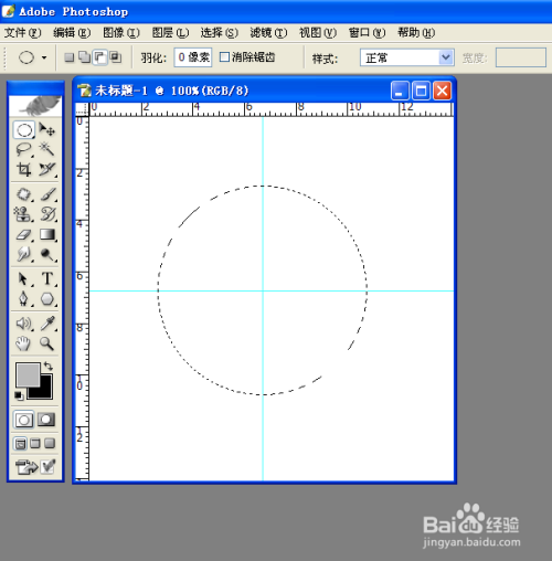 选择椭圆选框工具,将鼠标放在两线相交的位置,按下鼠标左键,同时按住Shift+Alt键,拖动鼠标,绘制一个由交点出发的正圆选区。