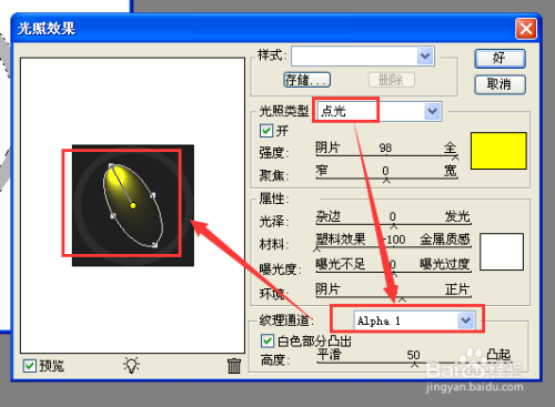切换到图层面板,选中图层1,点击菜单【滤镜---渲染---光照效果】,在弹出的对话框设置光照类型为点光,纹理通道选择刚才的Ahpha1,然后调节左边的光源方向手柄拉动,由左上到右下。点击好。