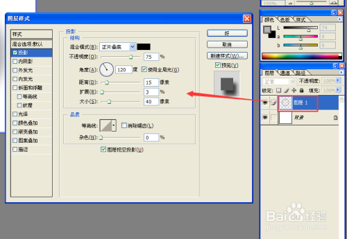 在图层面板中双击图层1,打开图层样式对话框,选中投影,设置角度为120,距离15,扩展3,大小40,点击好。