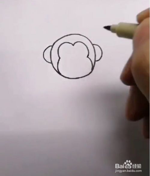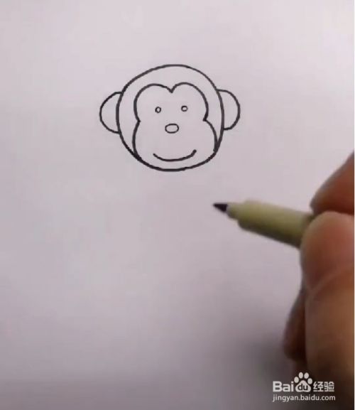 给小猴子添上五官:两个小圆圈表示耳朵要左右对称,一个大圆圈表示鼻子,一个弯弯的弧线表示嘴巴;
