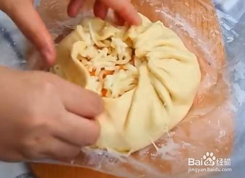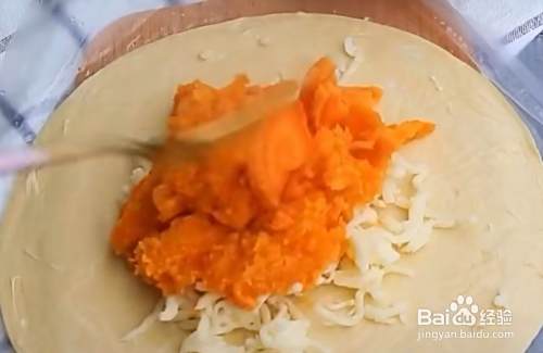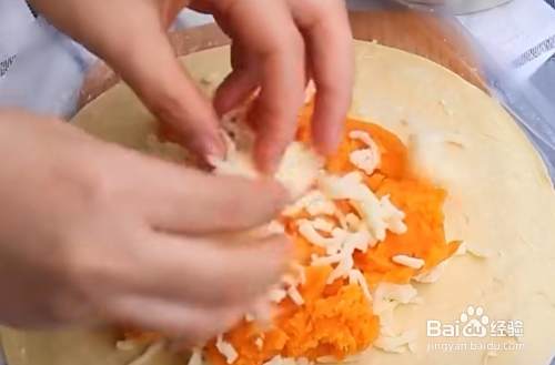 先取一张手抓饼,先撒一些马苏里拉芝士,再铺上三勺红薯泥,再撒如一些马苏里拉芝士,最后像包包子一样包好。其余两个也这样做