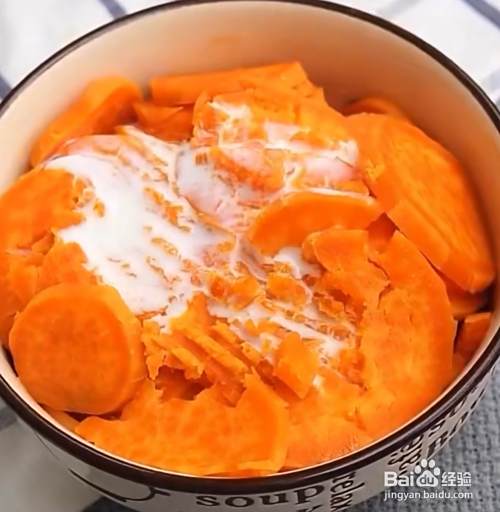 将蒸熟的红薯放入碗中,加入少许炼乳压成泥状。
