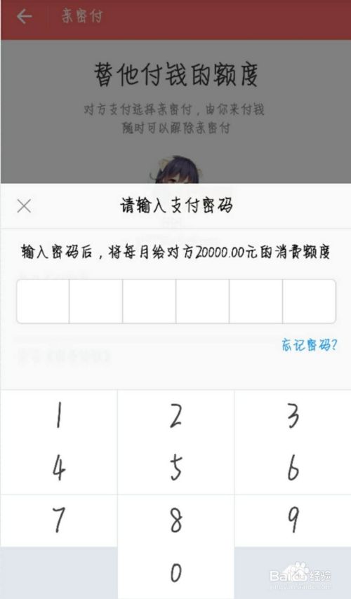 这里为亲友设置代付的额度,小编这里的额度是(100.00-20000.00)的额度,也就是说只能在这个范围设置。