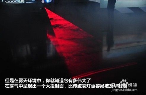 在雾天或雨天,三角形的激光束照亮空气中的水滴,清晰可见。这时候,激光后雾灯的光线穿过雾气形成一个向路面倾斜的三角光亮警示牌。总体来说,激光灯拥有巨大潜力,对大灯来说也是如此。